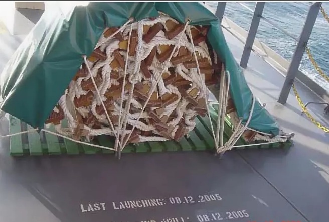 Чехол для штормтрапа выполнен из ПВХ ткани. Поверхность материала пропитана специальным водоотталкивающим составом. По периметру защитного полотна установлены металлические люверсы, через которые пропускается трос для надежной фиксации веревочной лестницы на палубе.